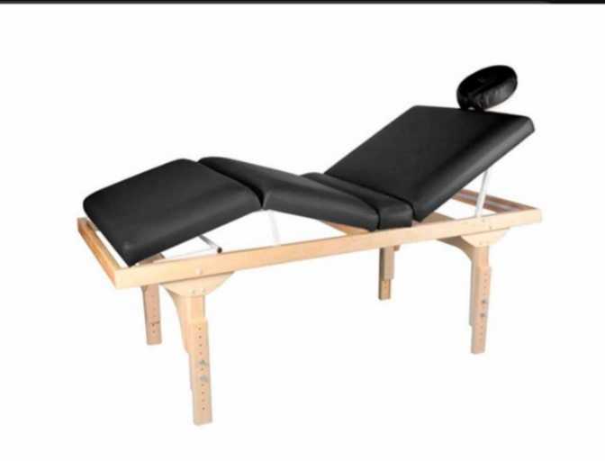 Sua estrutura é feita em madeira Caixeta tratada, reconhecida pela resistência e durabilidade, enquanto a altura regulável de 65 a 90 cm garante a postura ideal para diversos tipos de atendimento.